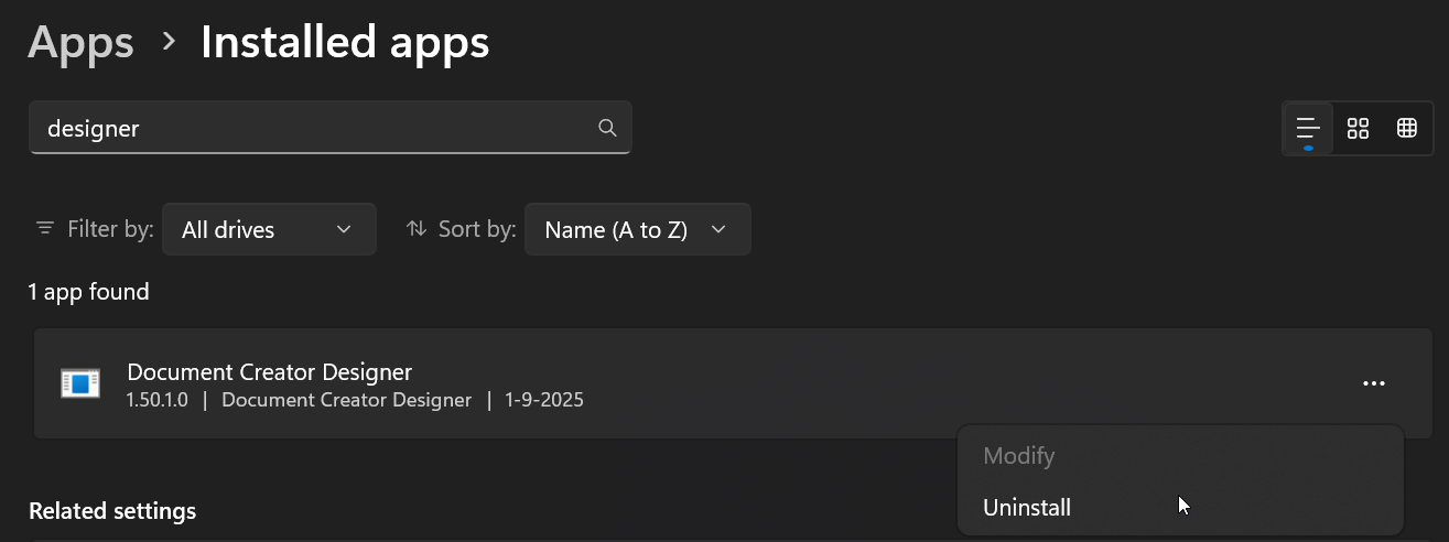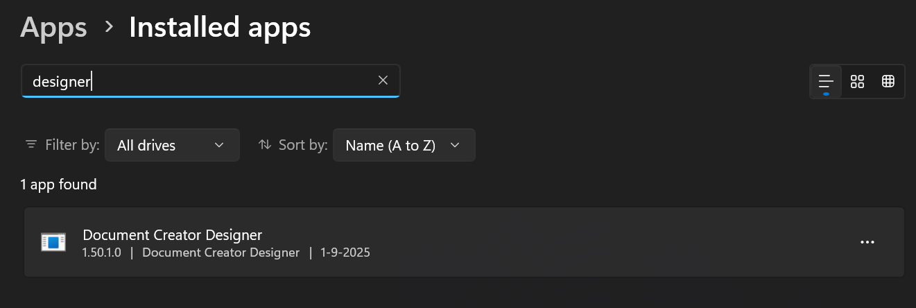 - Then, in the Settings window that opens, search for the “Document Creator Designer” application using the search bar.