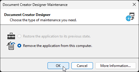 - In the Document Creator Designer Maintenance window that opens choose “Remove the application from this computer” and click on “OK“.